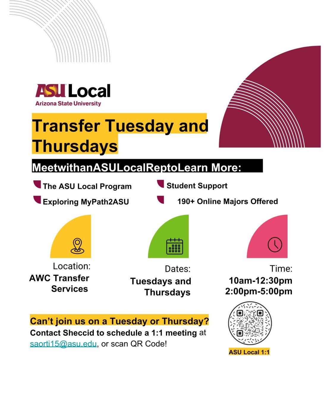 ASU Local is at Transfer Center on Tuesdays and Thursdays! Stop by AWC Transfer Center on Tuesdays and Thursdays from 10:00am-12:30pm and 2:00pm-5:00pm! Stop by to learn more about ASU Local Yuma!