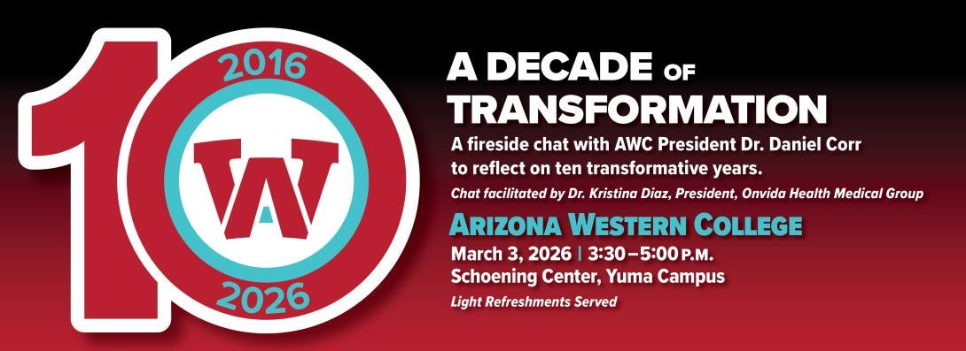 You are invited to join us for a special event, A Decade of Transformation, a fireside chat with President Dr. Daniel Corr. This conversation will reflect on how Arizona Western College has grown and changed over the past ten years and where we are headed next.