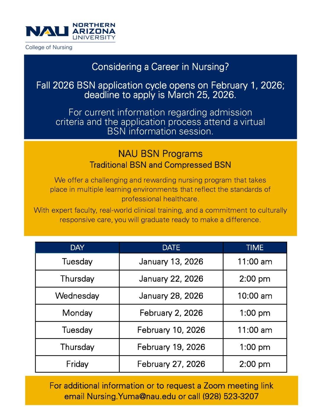 Visit https://nau.edu/yuma/bsn-nursing/, contact them at Nursing.Yuma@nau.edu or call 928-317-6442 for more information.