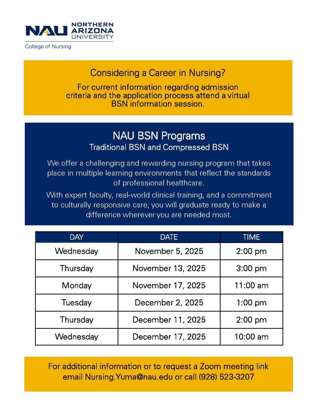 Visit https://nau.edu/yuma/bsn-nursing/, contact them at Nursing.Yuma@nau.edu or call 928-317-6442 for more information.