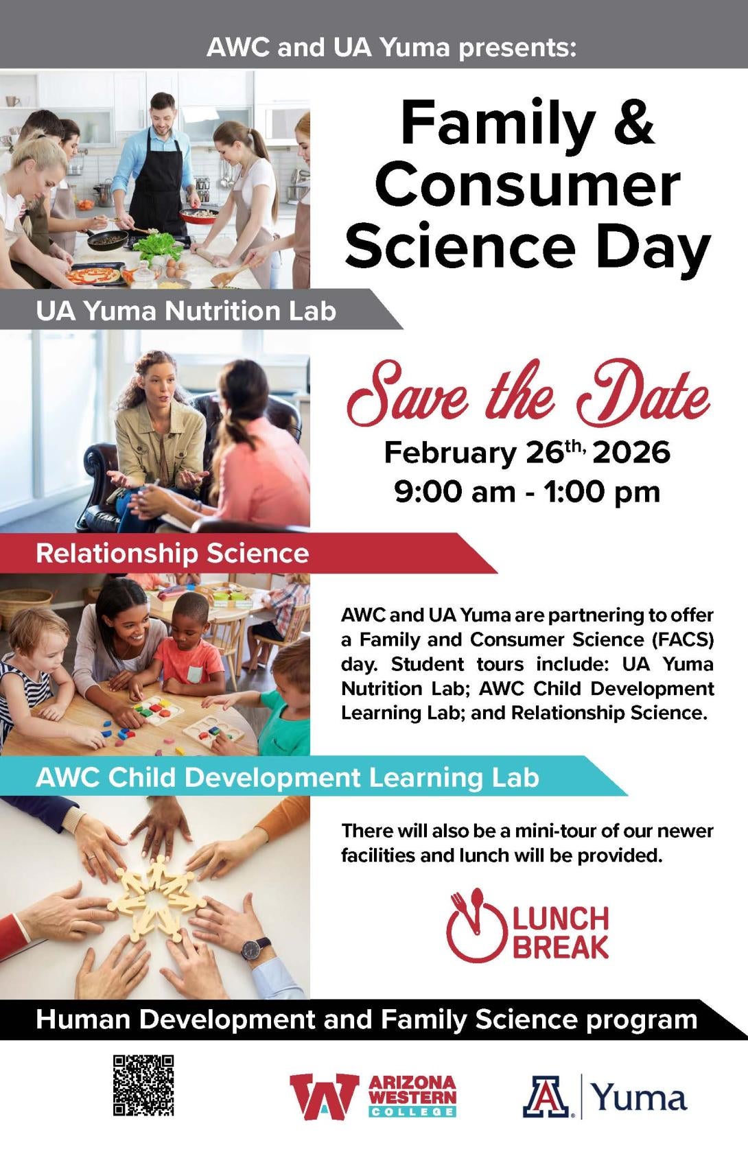 AWC and UA Yuma are partnering to offer a Family and Consumer Science (FACS) day. Student tours include: UA Yuma Nutrition Lab; AWC Child Development Learning Lab; and Relationship Science.