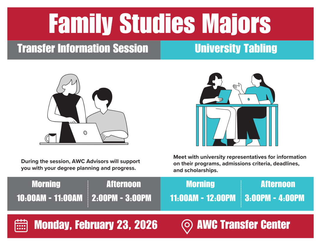 The Family Studies Major Advising and Transfer Information Session is designed for students interested in transferring to a university in this field. During the session, you’ll meet with university representatives to learn about their Family Studies programs, admission requirements, application deadlines, and available scholarships. You’ll also receive important information about AWC program requirements and how to stay on track for a successful transfer.