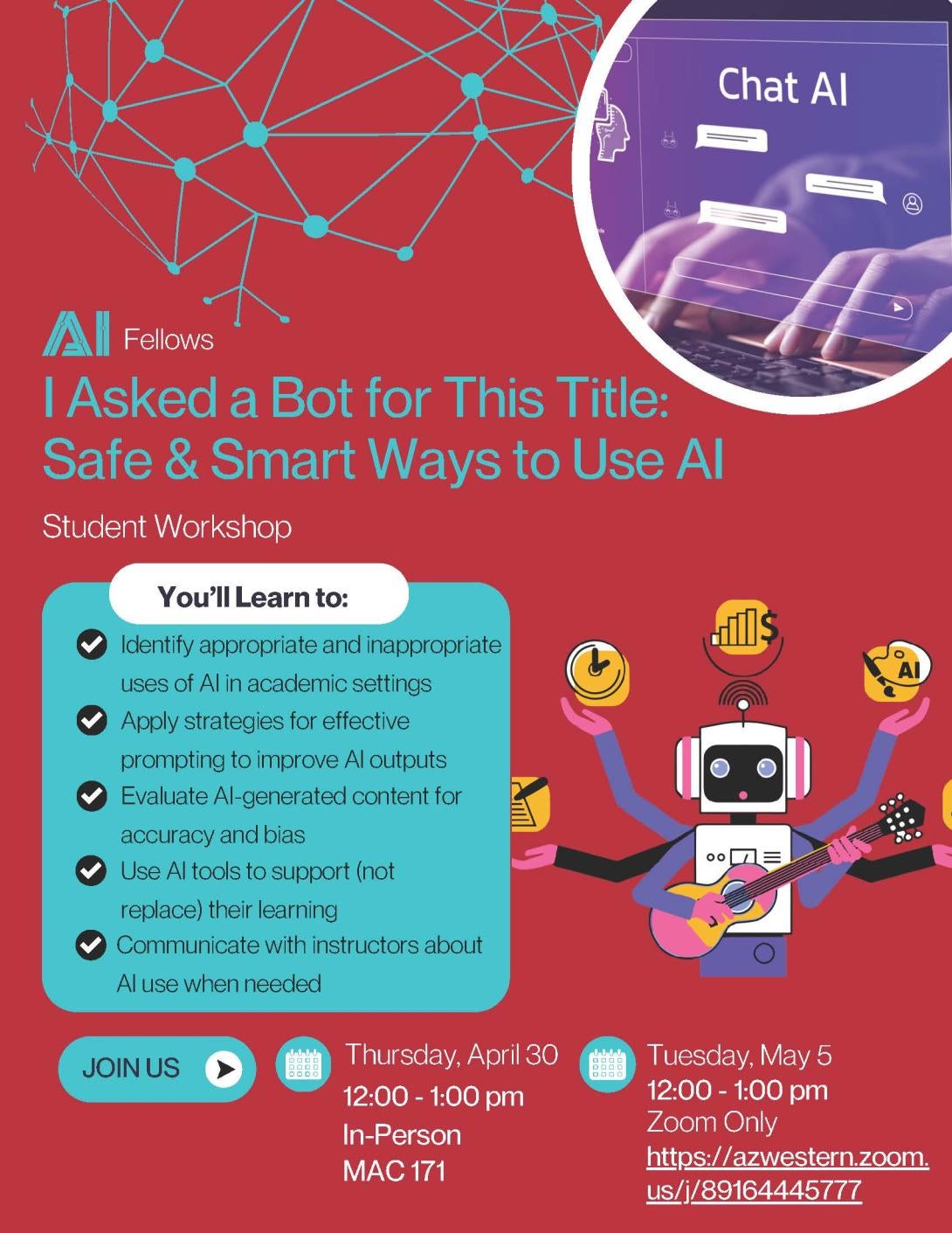 Curious about how to use AI tools the right way in your classes? Join us for an interactive workshop designed to help students use AI to support—not replace—their learning.