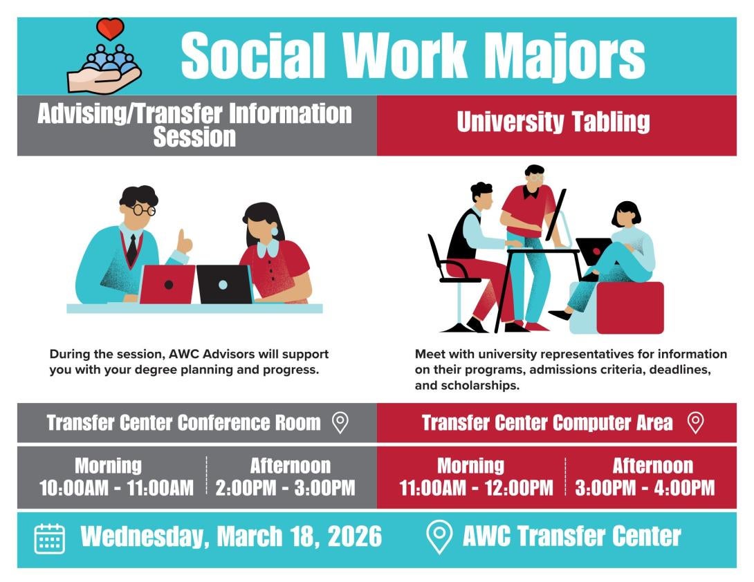 Join us for an informative session on the Social Work program! This is your opportunity to meet with AWC Academic Advisors who will guide you through the requirements and steps to succeed in the Social Work program at Arizona Western College. Whether you're just starting or planning your next steps, this session will provide the support and information you need to advance in your academic journey.